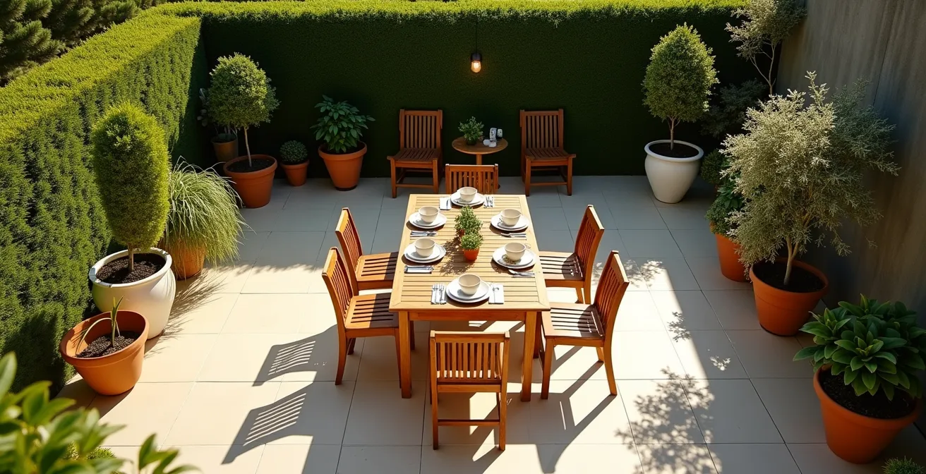 Utilisez des treillages, des étagères murales résistantes aux intempéries et des jardinières suspendues. Les angles peuvent accueillir des étagères d’angle ou des bancs triangulaires pour exploiter les zones perdues et maximiser la surface utilisable sans encombrer le sol.
